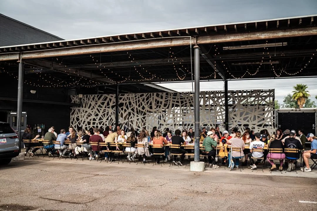 An outdoor gathering space with a covered patio. This raw space can take on any design vibe or layout for events like community dinners, parties and cocktail hours, while making the most of our beautiful Phoenix weather.